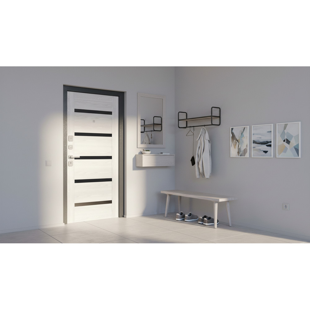 Входная дверь «Атлант» Сканди выполнена в современном скандинавском стиле, что придает ей элегантный и минималистичный вид. Черные стеклянные вставки на внутренней панели добавляют контраст и утонченность, делая дверь стильным акцентом в интерьере.